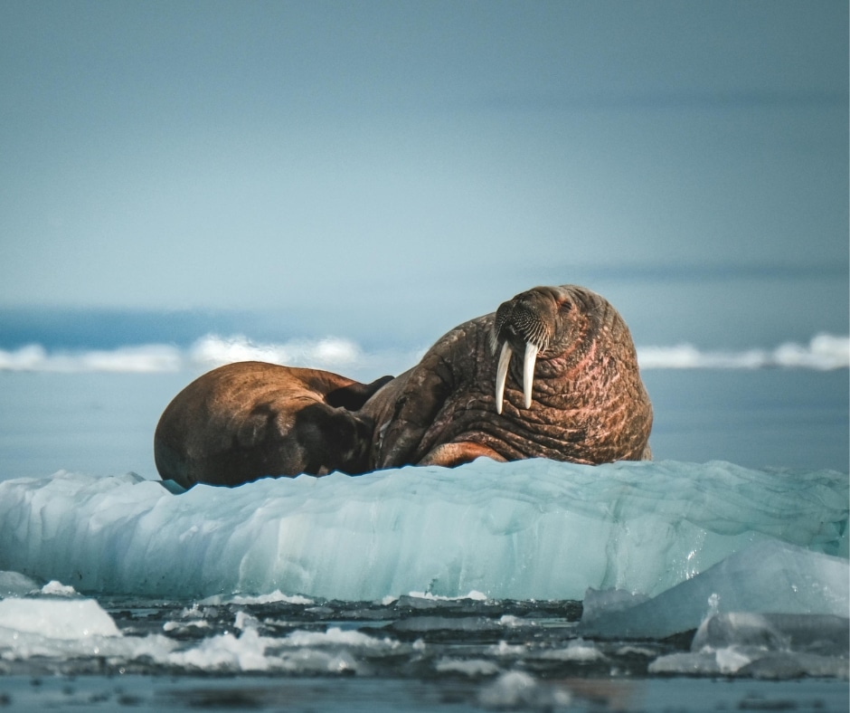 Walruses are social creatures native to Svalbard. Their long tusks make them an amazing species to behold.